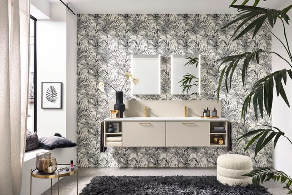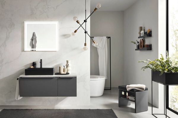 Badea Badmöbel; Oberflächen und Fronten aus: Melaminharzbeschichtung, Lackdekorbeschichtung, Lacklaminat, Schichtstoff, Glaslaminat, Glas, Echtholzfurnier, Steinfurnier; Fronten gemäß Anhang zum Vertrag.