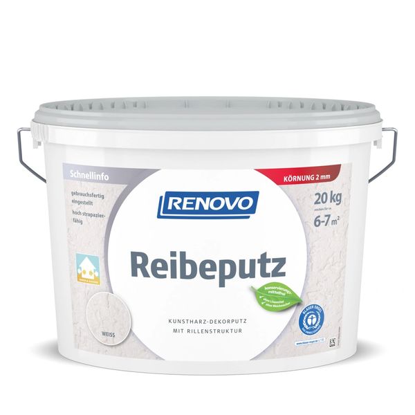 RENOVO Reibeputz ist ein gebrauchsfertiger, weißer Kunstharz-Rillenputz für dekorative Wand- und Fassadengestaltung. Er lässt sich leicht auftragen, ist verseifungs- und wetterbeständig, stoßfest, Wasser abweisend, widerstandsfähig, hoch strapazierfähig, diffusionsfähig und geruchsneutral. Nicht auf Wärmedämmverbundsystemen einsetzen.