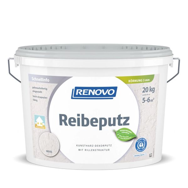 RENOVO Reibeputz ist ein gebrauchsfertiger, weißer Kunstharz-Rillenputz für dekorative Wand- und Fassadengestaltung. Er lässt sich leicht auftragen, ist verseifungs- und wetterbeständig, stoßfest, Wasser abweisend, widerstandsfähig, hoch strapazierfähig, diffusionsfähig, geruchsneutral. Nicht auf Wärmedämmverbundsystemen einsetzen.