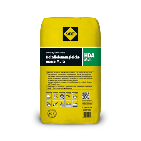 Unsere SAKRET Holzdielenausgleichsmasse HDA Multi ist zum Glätten und Nivellieren von Holzdielenböden, Holzspanplatten (V 100, OSB u.a.), allen zement- und calciumsulfatgebundenen Untergründen und abgesandeten Gußasphalt vor der Verlegung von PVC, Teppichböden, keramischen Fliesen, Platten, Parkett und Laminat sowie Marmor und Natursteinbelägen im Innenbereich sowie auf Fußbodenheizung einschließlich Roth- ClimaComfort® Compactsystem geeignet. Diese ist unter anderem spannungsarm, pumpfähig, hat einen sehr guten Verlauf, bindet hydraulisch schnell ab, ist hoch kunststoffvergütet und kann z.B. in einem Arbeitsgang bis zu 40 mm ohne Gewebebahnen und Gewebearmierung aufgetragen werden, ist stuhlrollengeeignet und besitzt ssomit eine hohe Festigkeit und Härte.