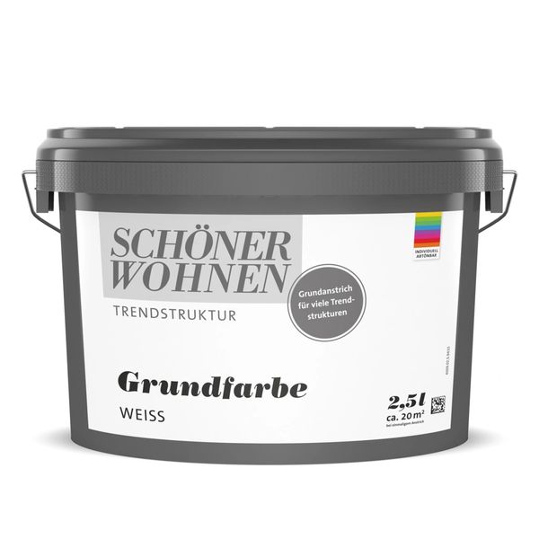 SCHÖNER WOHNEN Grundfarbe ist universell einsetzbar sowie lösemittel-, weichmacher- und konservierungsmittelfrei. Grundfarbe ist eine hochdeckende und tropfgehemmte Wand- und Deckenfarbe mit einer langen verarbeitungsoffenen Zeit. Abgetönt mit SCHÖNER WOHNEN Vollton- & Abtönfarbe lässt sich eine Vielzahl an Farbvariationen erzielen. Im passenden Farbton abgetönt ist Grundfarbe geeignet als Untergrund unter Wisch-Optik Effektlasur oder Metall-Optik Effektfarbe. Grundfarbe kann aber auch zur Abdeckung stark kontrastreicher Untergründe als Vorbereitung für die Marmor-Optik oder Beton-Optik genutzt werden. Geeignete Untergründe sind z. B. Raufaser- und Prägetapeten, alte Dispersionsfarbenanstriche sowie Putz und Gipskartonplatten.