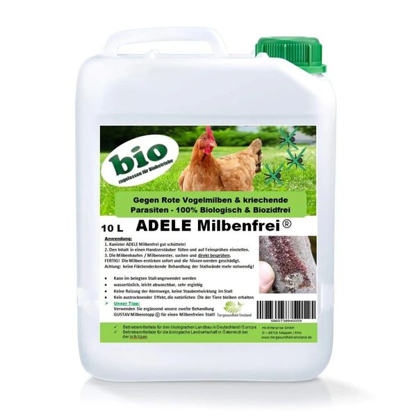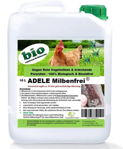 Rote Vogelmilben im Hühnerstall biologisch bekämpfen – mit ADELE Milbenfrei®. ADELE wird direkt auf die befallenen Hotspots und Nester gesprüht und verstopft die Atemöffnungen der Milben – sie ersticken sofort, die Nissen werden geschädigt und der Vermehrungszyklus wird unterbrochen. Gebrauchsfertig, resistenzsicher und 100% biozidfrei. Keine Wartezeiten, keine Rückstände im Ei, keine Schutzkleidung erforderlich. Im laufenden Betrieb anwendbar – kein Betriebsausfall. Ideal für gewerbliche Geflügelbetriebe und Hobbyhaltung. Bio-zertifiziert: FiBL-gelistet, EU Öko, Demeter, Bioland, Naturland, Biokreis, Gää bis 12/2027. Empfohlen als Schritt 1 im bewährten 2-Schritte-System gegen die Rote Vogelmilbe – kombinierbar mit GUSTAV Milbenstopp® für dauerhafte Milbenfreiheit.
