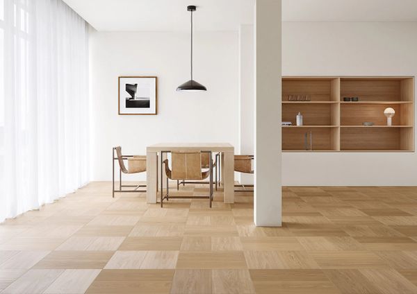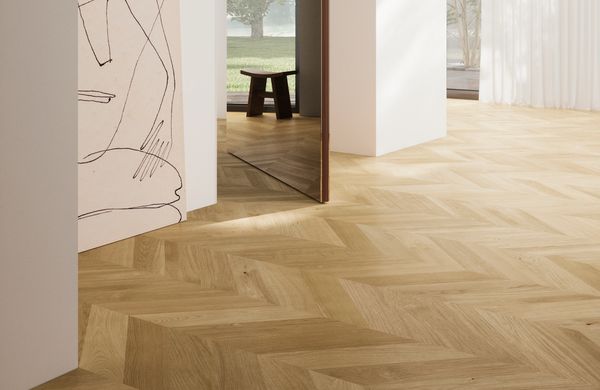 Thanks to the 45° angle of the individual strips, Formpark Rombico is ideal for creating a French herringbone – also known as the chevron look. In this arrangement, the parquet planks form diagonal lines that give the room a fresh perspective. The generous size of the planks also allows other laying patterns to be reinterpreted – whether in a clean, geometric style or in a dynamic zig-zag design.